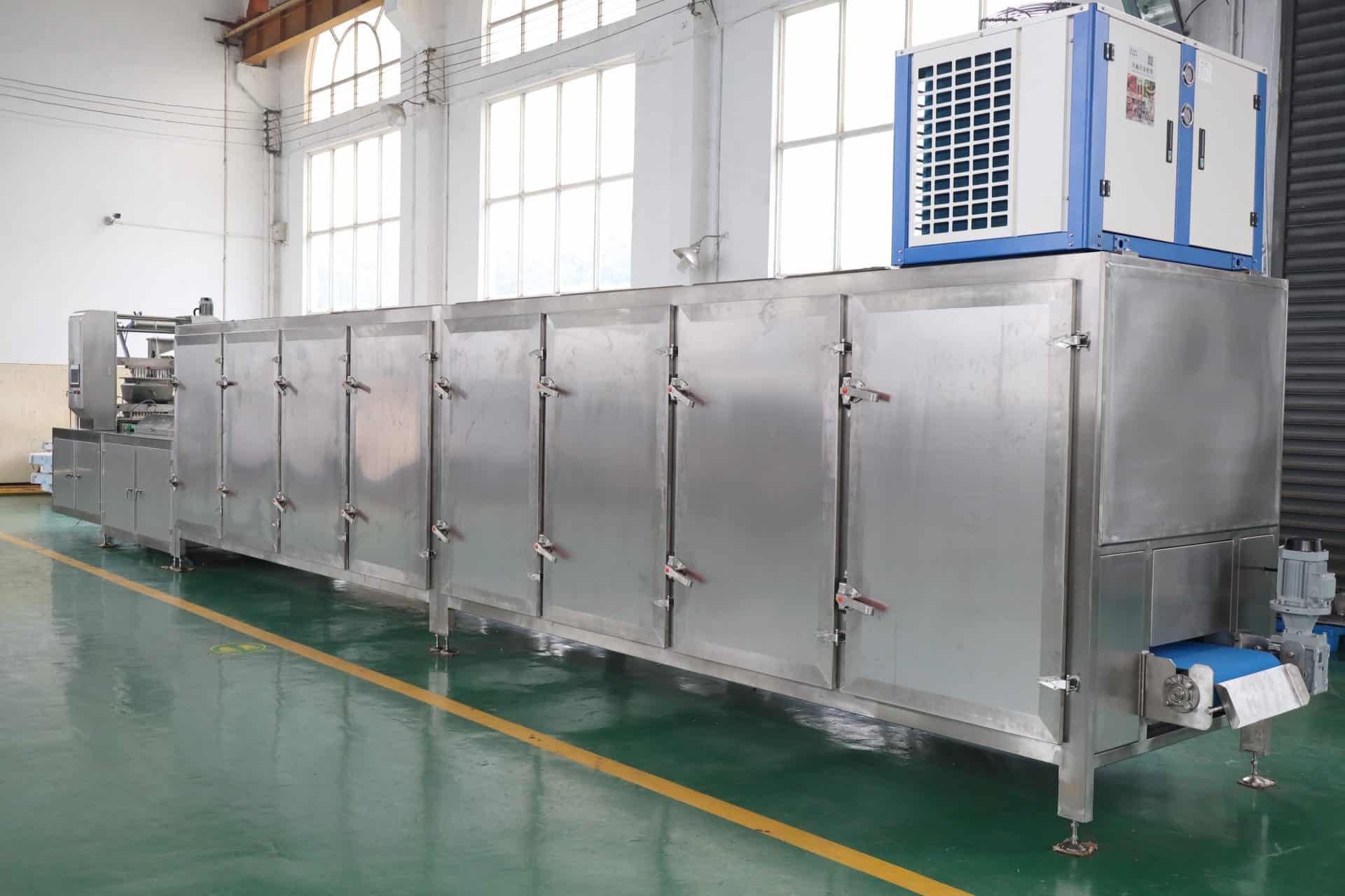 The cooling system is an essential component of the production line, specifically designed to rapidly and efficiently reduce the temperature of the candy. By ensuring precise cooling, it helps maintain the structural integrity, texture, and overall quality of the final product.